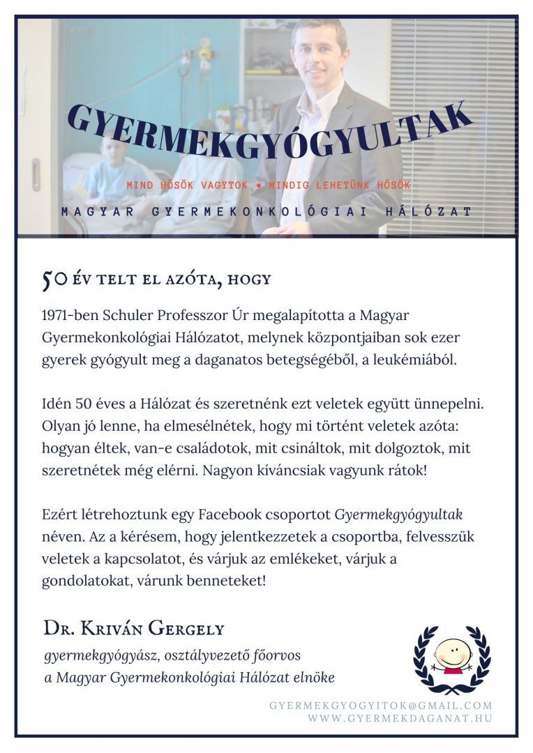 A Magyar Gyermekonkológiai Hálózat 50 éves évfordulója kapcsán elindítja “Gyermekgyógyultak” facebook csoportját, ahol egykor daganatos megbetegedéssel küzdő, vagy leukémiából felgyógyultak jelentkezését várja. Kérik, hogy ha te is egy vagy közülük, meséld el mi történt azóta veled, mit csinálsz, hol dolgozol. Oszd meg történeted másokkal.